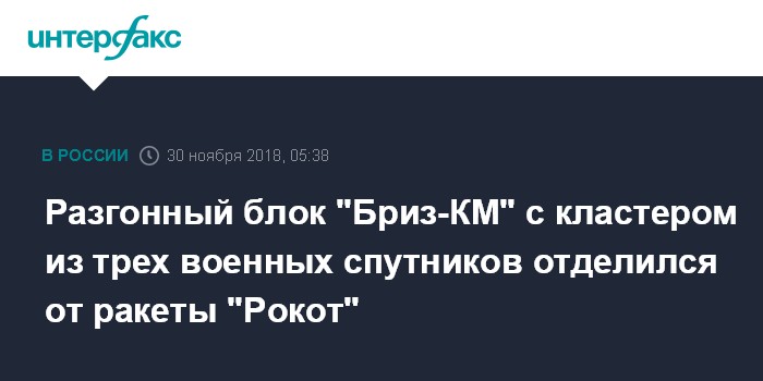 Москва. 30 ноября. INTERFAX.RU - Отделился от ракеты "Рокот" разгонный блок "Бриз-КМ" с кластером из трех военных спутников, сообщили в пятницу в департаменте информации и массовых коммуникаций Минобороны РФ.