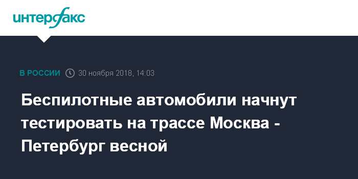 Москва. 30 ноября. INTERFAX.RU - Испытания автомобилей, оснащенных элементами беспилотных технологий, на участке трассы М-11 в обход Вышнего Волочка начнутся весной 2019 года, сообщил журналистам соруководитель рабочей группы по разработке и реализации дорожной карты НТИ "Автонет" Александр Гурко в кулуарах форума Urban Mobility.