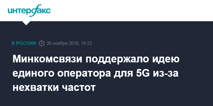 Москва. 30 ноября. INTERFAX.RU - Создание единой компании, которая будет развивать инфраструктуру для 5G, является оптимальной моделью в условиях нехватки частот, пригодных для этой технологии, считают в Минкомсвязи.