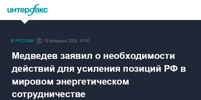 "Кроме того, необходимо принять программу действий по усилению позиций нашей страны на мировой арене. Причем, имею в виду позицию в ключевых международных организациях, которые с этим связаны, - заявил Медведев. - Дальнейшая наша деятельность на международной арене в энергетическом сотрудничестве будет зависеть и от нашего положения, и от благосостояния наших граждан, и в конечном счете, от состояния международной энергетической безопасности".
