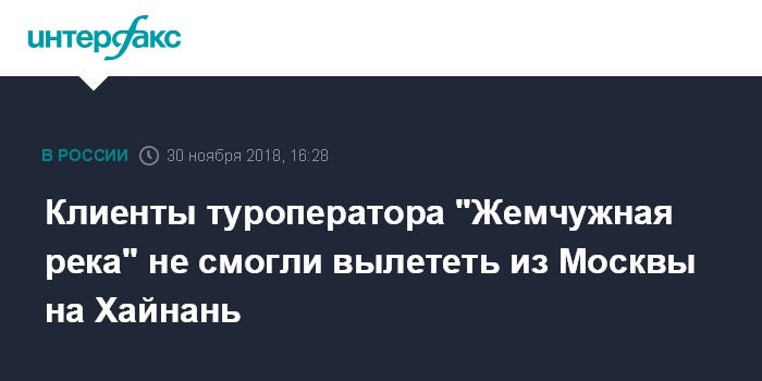 Около 300 российских туристов третьи сутки не могут вылететь с острова ХайнаньЧитать подробнее"Рейс "Жемчужной реки" из Москвы на Хайнань, который должен был состояться 30 ноября в 11.30, задержан до 16.00. Туристам выписали билеты только в 14.40. Задержка произошла из-за несвоевременной оплаты рейса туроператором. До этого времени туроператор и перевозчик должны разрешить возникшие трудности", - рассказали в ассоциации.