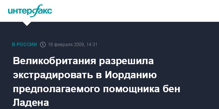 Москва. 18 февраля. INTERFAX.RU - Палата лордов, являющаяся высшей судебной инстанцией Великобритании, разрешила в среду экстрадицию в Иорданию Абу Катады, одного из предполагаемых соратников лидера террористической группировки "Аль-Каида" Усамы бен Ладена.