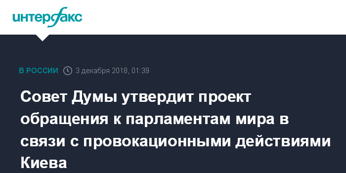 Москва. 3 декабря. INTERFAX.RU - Совет Госдумы в понедельник рассмотрит проект обращения к парламентам стран мира и к другим международным парламентским организациям в связи с обострением международной обстановки в результате непрекращающихся провокационных действий украинских властей.