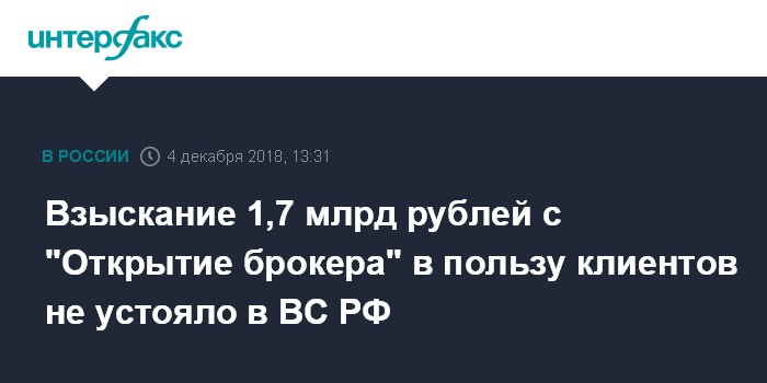 Москва. 4 декабря. INTERFAX.RU - Верховный суд (ВС) РФ во вторник отменил судебные постановления о взыскании с компании "Открытие брокер" 1,7 млрд рублей в пользу бывших клиентов, передает корреспондент "Интерфакса" из зала суда.
