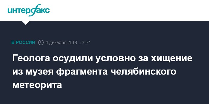 Москва. 4 декабря. INTERFAX.RU - Центральный суд Челябинска вынес приговор по делу о хищении из областного музея фрагмента метеорита, упавшего в регионе в 2013 году, сообщает пресс-служба регионального УФСБ во вторник.