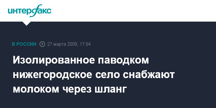Москва. 27 марта. INTERFAX.RU - Необычным способом получают молоко жители села Никольское Гаганского района Нижегородской области, отрезанные от внешнего мира в результате разлива реки Пьяна. Как сообщили агентству "Интерфакс" в пресс-службе ГУ МЧС РФ региона, на двух берегах разлившейся из-за паводка реки стоят два столба, на которые натянут шланг, по которому молоко передают в село из других населенных пунктов. "Подобный способ доставки в село молока используется во время паводка уже на протяжении 10 лет", - добавил собеседник агентства.