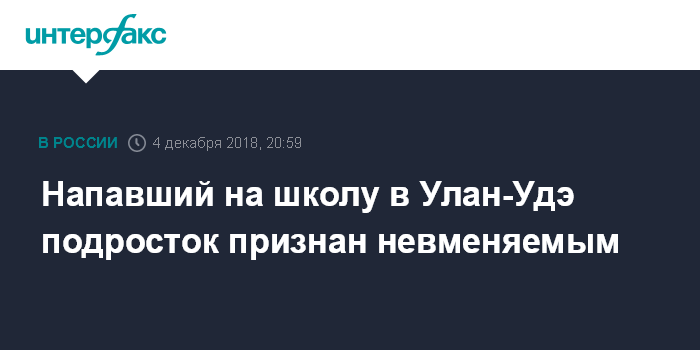 Москва. 4 декабря. INTERFAX.RU - Подросток, 19 января напавший с топором на учеников и учителя школы в Улан-Удэ, признан невменяемым, заявили во вторник в Следственном комитете.