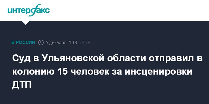 Москва. 5 декабря. INTERFAX.RU - Суд в Ульяновске приговорил участников преступной группы, инсценировавших ДТП для получения страховых выплат, к лишению свободы на сроки от полутора до шести лет за мошенничество.