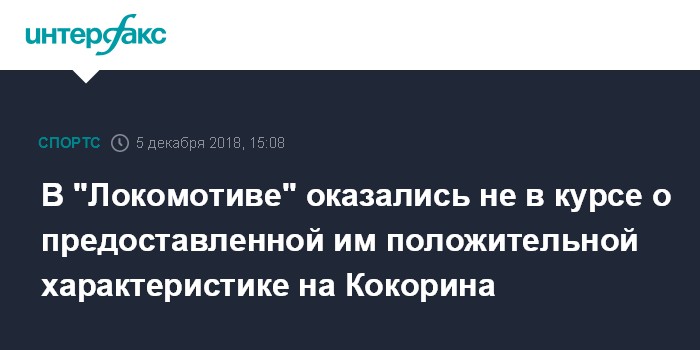 Москва. 5 декабря. INTERFAX.RU - В московском футбольном клубе "Локомотив" не владеют информацией о поступившей в суд положительной характеристике на Александра Кокорина от лица клуба, сообщает Sport 24.