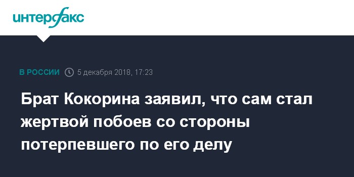 Москва. 5 декабря. INTERFAX.RU - Обвиняемый в хулиганстве Кирилл Кокорин - младший брат нападающего "Зенита" Александра Кокорина - попросил следствие проверить действия водителя Виталия Соловчука, который признан потерпевшим по их делу, на предмет состава преступления, заявил "Интерфаксу" адвокат молодого человека Вячеслав Барик.