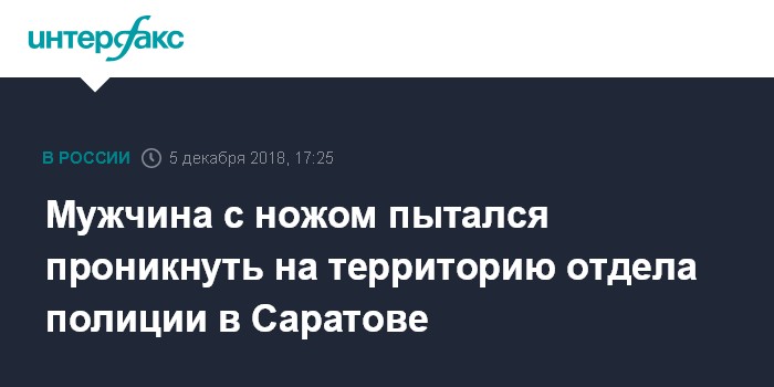 "Неизвестный, угрожая постовому предметом, похожим на нож, пытался проникнуть на территорию управления МВД РФ по Саратову. В результате происшествия пострадавших нет", - сообщили агентству "Интерфакс" в пресс-службе ГУ МВД по региону в среду.