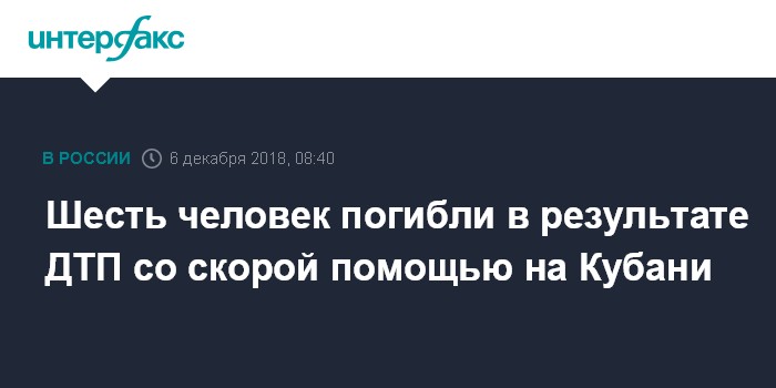 "На 9-м километре автодороги Усть-Лабинск - Лабинск - Упорная в районе станицы Некрасовская произошло столкновение автомобиля ВАЗ 2114 с каретой скорой помощи. В результате ДТП на месте погибли 6 человек, находящиеся в автомобиле ВАЗ, среди которых двое детей", - говорится в сообщении на сайте ГУ МВД Краснодарского края.