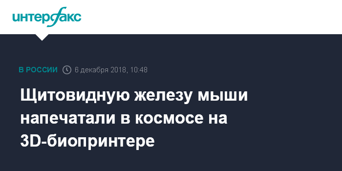 Москва. 6 декабря. INTERFAX.RU - Органный конструкт щитовидной железы мыши впервые в мире создан на биопринтере в условиях космоса, сообщает "Роскосмос".
