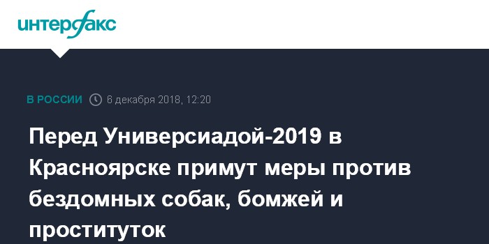 Москва. 6 декабря. INTERFAX.RU - Власти Красноярска примут меры в отношении асоциальных личностей и бездомных собак перед проведением Универсиады-2019, рассказал журналистам заместитель главы города Владислав Логинов.