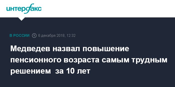 Москва. 6 декабря. INTERFAX.RU - Глава правительства РФ Дмитрий Медведев назвал решение о повышении пенсионного возраста в России самым трудным за последнее десятилетие и сообщил, что оно рассчитано на длительную перспективу.