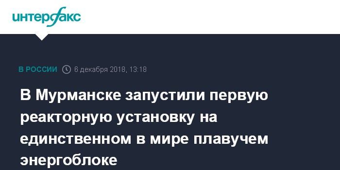 "В Мурманске, на единственном в мире атомном плавучем энергоблоке (ПЭБ) "Академик Ломоносов", который сооружается на площадке ФГУП "Атомфлот" при участии специалистов АО "Балтийский завод", первая из двух реакторных установок (РУ-1) выведена на энергетический уровень мощности 10%. Таким образом, на ПЭБ состоялся энергетический пуск одного из двух реакторов - реактора правого борта", - сообщает АО "Концерн Росэнергоатом".