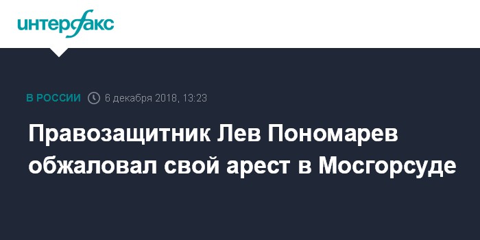 Москва. 6 декабря. INTERFAX.RU - Руководитель движения "За права человека" Лев Пономарев обжаловал в Мосгорсуде решение Тверского суда об аресте на 25 суток за повторное нарушение правил проведения массовых мероприятий, сообщила общественный защитник Пономарева Ирина Яценко.