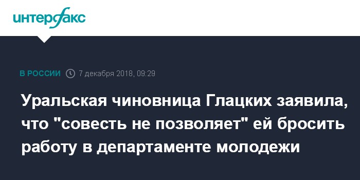 "Я считаю, что те дела, которые были направлены на молодежь Свердловской области, которые были созданы вновь с моим приходом, с формированием департамента, его созданием, мне совесть не позволяет и, в принципе, даже человеческий фактор не позволяет это бросить. Бросить около 400 тыс. вовлеченных в наши мероприятия ребят", - сказала Глацких в интервью блогеру Сергею Колясникову, размещенном на YouTube.