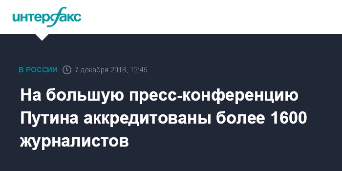 Москва. 7 декабря. INTERFAX.RU - На ежегодную пресс-конференцию президента РФ Владимира Путина, которая состоится 20 декабря, аккредитовались свыше 1600 журналистов.