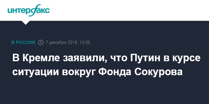 Москва. 7 декабря. INTERFAX.RU - Президент РФ Владимир Путин проинформирован о ситуации, сложившейся с Фондом режиссера Александра Сокурова, он принял это к сведению. Об этом сообщил журналистам в пятницу пресс-секретарь главы государства Дмитрий Песков.