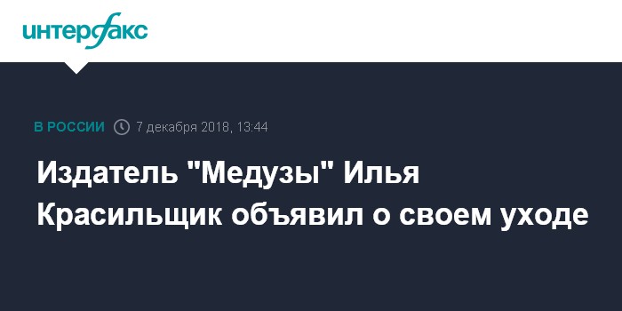 Москва. 7 декабря. INTERFAX.RU - Издатель "Медузы" Илья Красильщик в пятницу сообщил в своем фейсбуке, что уходит из издания с 1 января 2019 года.