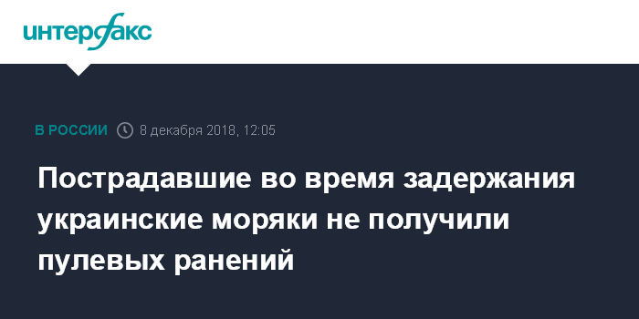Москва. 8 декабря. INTERFAX.RU - Задержанные в ходе инцидента в Керченском проливе украинские моряки не получали прямых пулевых ранений, сообщил начальник следственного управления ФСБ РФ Михаил Шишов. По его словам, моряки получили осколочные ранения при повреждении катера.