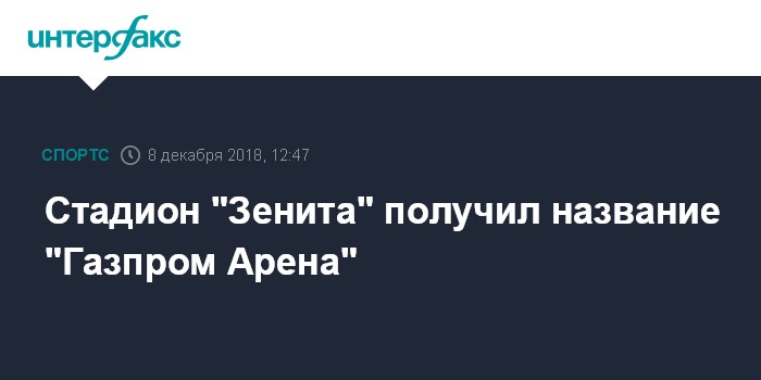 "По условиям соглашения, подписанного между клубом и ПАО "Газпром", новое название стадиона будет интегрировано на сотни носителей - от логотипов на внешнем фасаде арены до униформы сотрудников, сувенирной продукции и билетов. Арена перешла под управление сине-бело-голубых на основе концессионного договора на 49 лет, который "Зенит" и правительство Санкт-Петербурга заключили в феврале", - говорится в сообщении.