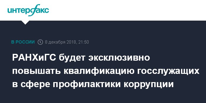 Москва. 8 декабря. INTERFAX.RU - Российская академия народного хозяйства и государственной службы (РАНХиГС) при президенте РФ определена единственным исполнителем госзаказов на повышение квалификации госслужащих по профилактике коррупции.