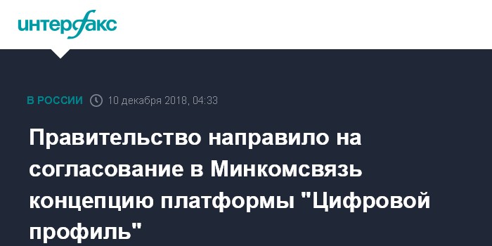 Москва. 10 декабря. INTERFAX.RU - Аппарат правительства направил на согласование в Минкомсвязь подготовленную ЦБ и "Ростелекомом" концепцию платформы "Цифровой профиль", сообщает в понедельник "Коммерсант".