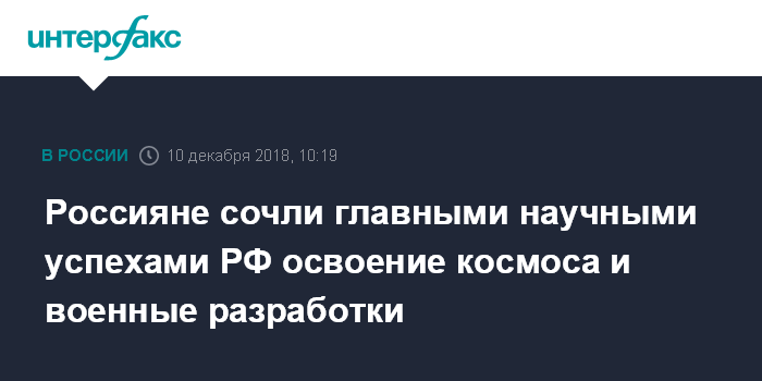 Москва. 10 декабря. INTERFAX.RU - Треть россиян считают, что отечественная наука наиболее успешна в сфере космических и военных разработок, свидетельствуют данные опроса ВЦИОМ, поступившие в понедельник в "Интерфакс".