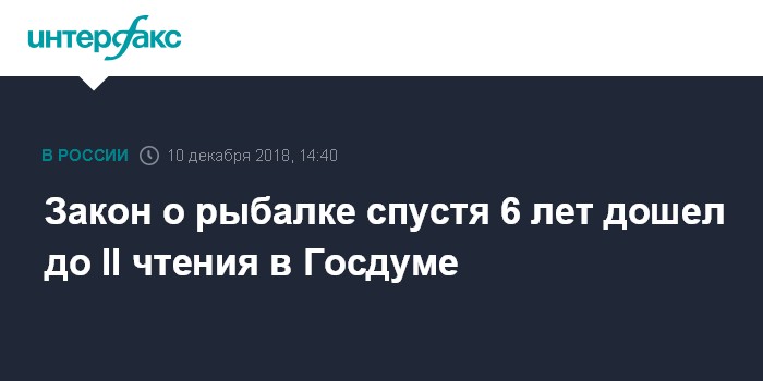 Москва. 10 декабря. INTERFAX.RU - Госдума во вторник рассмотрит во втором чтении законопроект, устанавливающий право на свободную и бесплатную любительскую рыбалку в России, сообщил глава комитета Госдумы по природным ресурсам, собственности и земельным отношениям Николай Николаев ("Единая Россия").