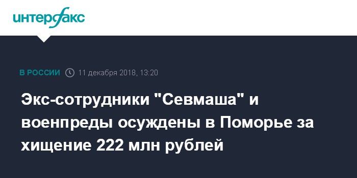 Москва. 11 декабря. INTERFAX.RU - Северодвинский гарнизонный военный суд в Архангельской области вынес приговор бывшим работникам "Севмаша" и специалистам военного представительства Министерства обороны (ВП МО) за хищение в особо крупном размере.