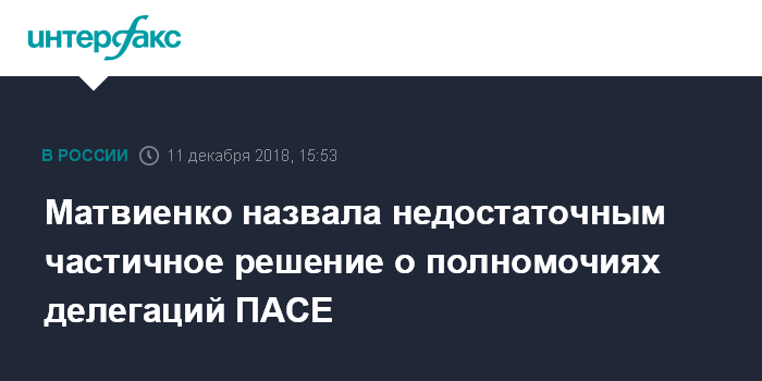 Москва. 11 декабря. INTERFAX.RU - Россию не удовлетворяет предложение регламентного комитета Парламентской ассамблеи Совета Европы (ПАСЕ) о частичном смягчении ограничений для национальных делегаций, заявила спикер Совета Федерации Валентина Матвиенко.