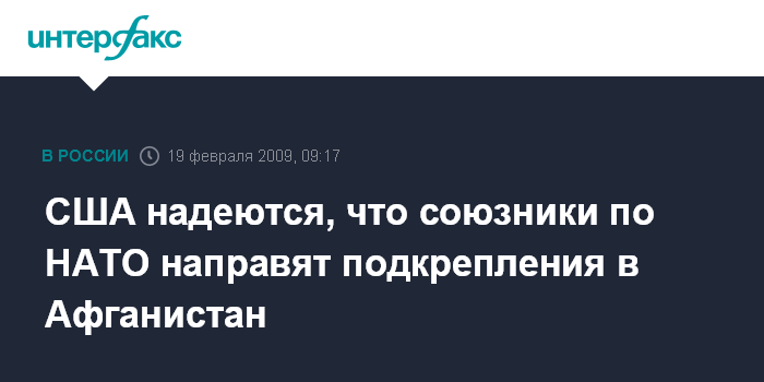 Москва. 19 февраля. INTERFAX.RU - Американская администрация призвала союзников по НАТО направить подкрепления в Афганистан для борьбы против талибов, заявил министр обороны США Роберт Гейтс.