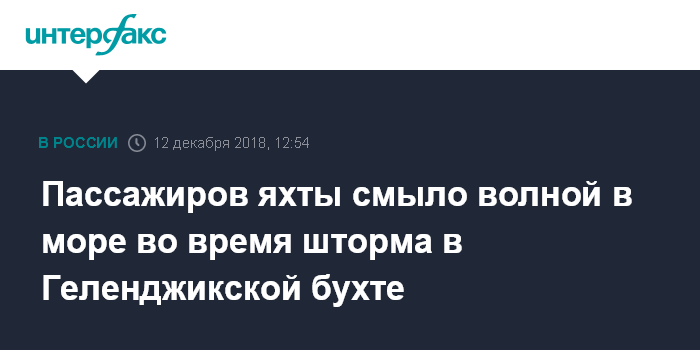 Москва. 12 декабря. INTERFAX.RU - Яхта попала в шторм в акватории Геленджикской бухты, один человек пропал без вести. Об этом сообщила пресс-служба следственного управления на транспорте по ЮФО в среду.