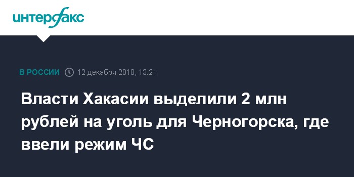 Москва. 12 декабря. INTERFAX.RU - Правительство Хакасии выделило из резервного фонда 2 млн рублей на покупку угля городу Черногорску, где ввели режим чрезвычайной ситуации, сообщает пресс-служба правительства республики.
