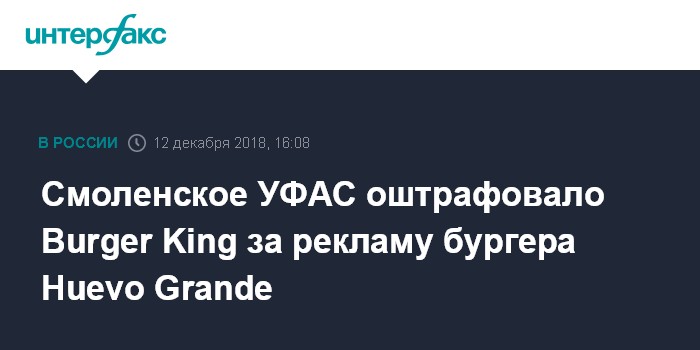 Проверка УФАС проводилась по обращению посетителя ресторана Burger King в Смоленске. В своем заявлении он указал, что на экранах в ресторане была размещена надпись "Huevo Grande" без какого-либо перевода на русский язык. При этом ее сменяла надпись "Короли вкуса", сказано в документе.