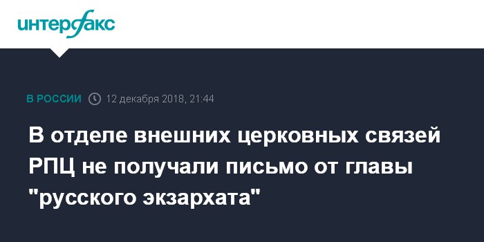Москва. 12 декабря. INTERFAX.RU - В отделе внешних церковных связей (ОВЦС) Московского патриархата заявили, что не получали письмо главы упраздненного Константинополем "русского экзархата" в Западной Европе, которое появилось в среду в интернете.