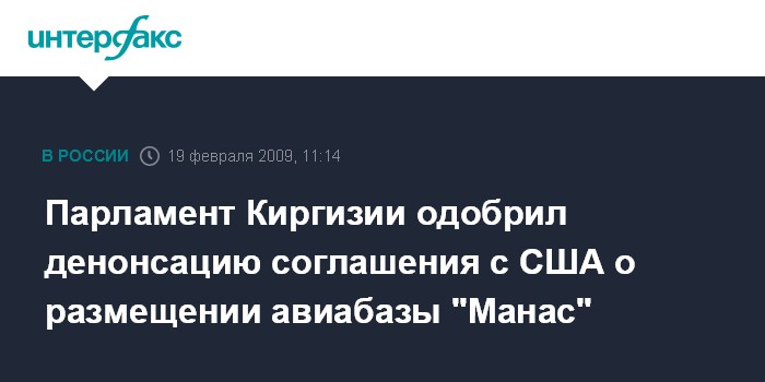 Москва. 19 февраля. INTERFAX.RU - Депутаты парламента Киргизии на заседании в четверг проголосовали за денонсацию соглашения с США о размещении авиабазы "Манас" и поддержали предложение киргизского правительства о выводе коалиционной базы с территории республики.