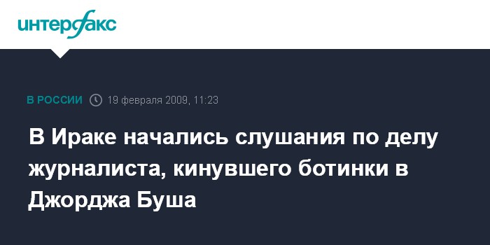 Москва. 19 февраля. INTERFAX.RU - Суд в Багдаде приступил в четверг к рассмотрению дела иракского журналиста Мунтазира аз-Заиди, швырнувшего ботинки в бывшего президента США Джорджа Буша-младшего. За подобное нападение, произошедшее 14 декабря прошлого года во время визита Буша в Ирак, журналист может быть приговорен к 15 годам тюрьмы, отмечают западные СМИ.
