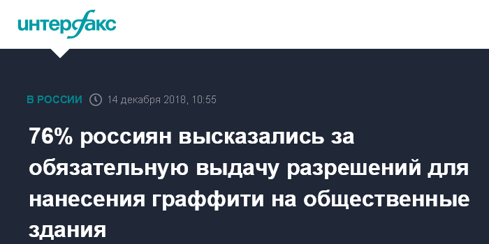 Москва. 14 декабря. INTERFAX.RU - Три четверти россиян поддерживают идею получения разрешений для желающих нарисовать граффити на стенах общественных зданий, свидетельствуют данные опроса ВЦИОМ, поступившие в пятницу в "Интерфакс".