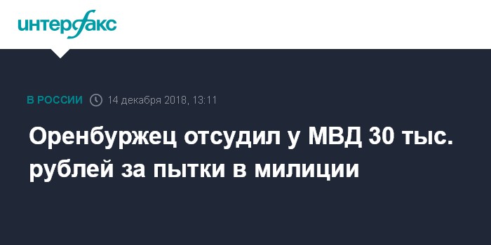 Москва. 14 декабря. INTERFAX.RU - Ленинский районный суд Оренбурга постановил взыскать с Министерства внутренних дел России компенсацию морального вреда в пользу местного жителя Максима Ниматова, который десять лет назад пожаловался на пытки в милиции.