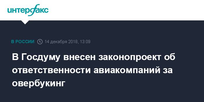 "Депутаты - активисты Народного фронта внесли на рассмотрение Госдумы законопроект о введении административной ответственности за овербукинг, при котором авиаперевозчик намеренно продает больше билетов, чем мест в самолете, в расчете на то, что часть пассажиров не придет на посадку", - говорится в сообщении пресс-службы.
