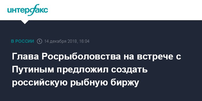 Москва. 14 декабря. INTERFAX.RU - Росрыболовство предлагает создать в России рыбную биржу, через которую компании смогут реализовывать свою продукцию. Об этом заявил глава ведомства Илья Шестаков на встрече с президентом РФ Владимиром Путиным.
