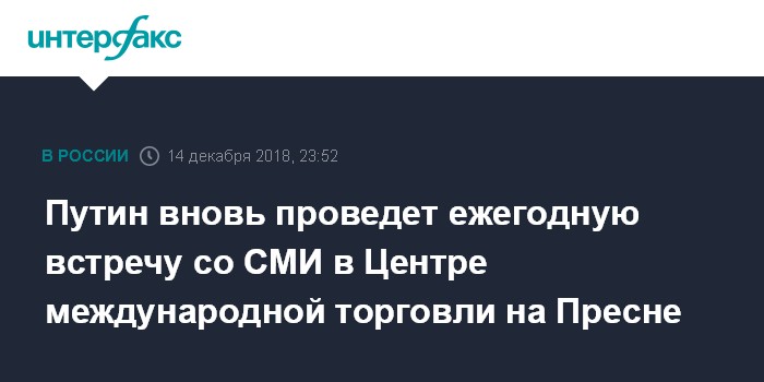 Москва. 14 декабря. INTERFAX.RU - Большая ежегодная пресс-конференция президента РФ Владимира Путина, запланированная на 20 декабря, вновь пройдет в Центре международной торговли, сообщила пресс-служба Кремля.