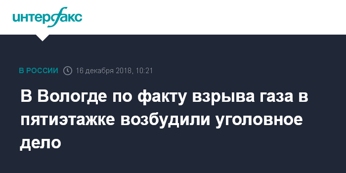 Москва. 16 декабря. INTERFAX.RU - В Вологде возбудили уголовное дело по факту взрыва в квартире пятиэтажного дома на улице Карла Маркса, сообщает региональное управление Следственного комитета.