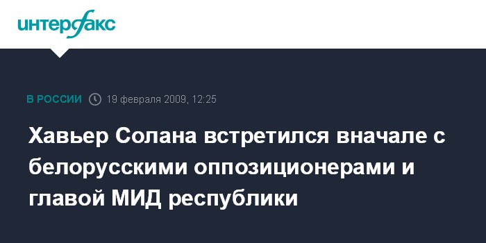 Москва. 19 февраля. INTERFAX.RU - Встреча министра иностранных дел Белоруссии Сергея Мартынова с Верховным представителем по вопросам общей внешней политики и политики безопасности ЕС, генсеком Совета ЕС Хавьером Соланой состоялась в четверг в Минске.