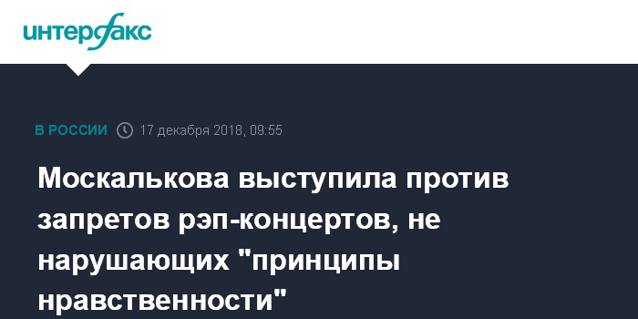 Москва. 17 декабря. INTERFAX.RU - Рэп-музыку нельзя запрещать, она должна иметь право на существование, если не нарушает законы и принципы нравственности, считает уполномоченный по правам человека в Российской Федерации Татьяна Москалькова.