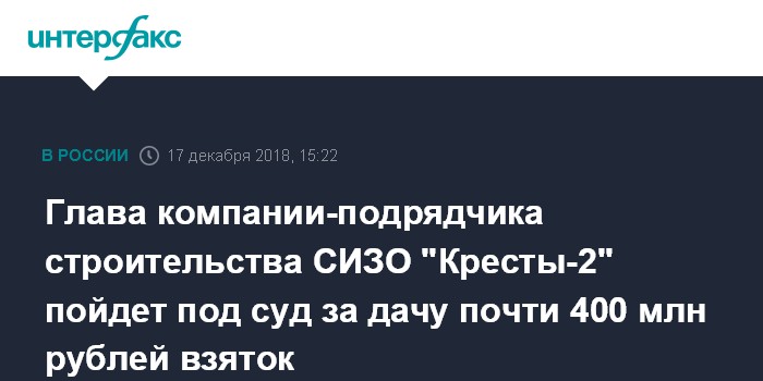 Глава компании-подрядчика строительства СИЗО "Кресты-2" пойдет под суд за дачу почти 400 млн рублей взяток