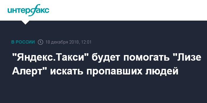 Москва. 18 декабря. INTERFAX.RU - Сервис "Яндекс.Такси" начал сотрудничать с поисково-спасательным отрядом "Лиза Алерт", включив для водителей такси возможность прямо в приложении получать ориентировки на пропавших людей, сообщила во вторник пресс-служба "Яндекс.Такси".